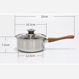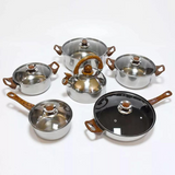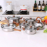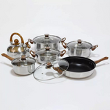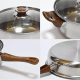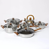 Praturtintas praktinėmis savybėmis, mūsų puodų rinkinys sukurtas patogumui. Grūdinto stiklo dangteliai su garų išleidimo angomis leidžia stebėti maisto eigą neišskiriant šilumos, o vėsios medienos tekstūros rankenos užtikrina patogų ir "retro" stiliaus rankeną.