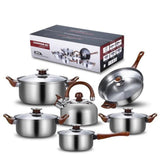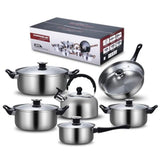 Pristatome mūsų universalų puodų rinkinį, kruopščiai sukurtą, kad pagerintumėte jūsų kulinarinius nuotykius. Šį komplektą sudaro: keptuvė, trijų dydžių puodai, virdulys bei nepridegantis katiliukas.